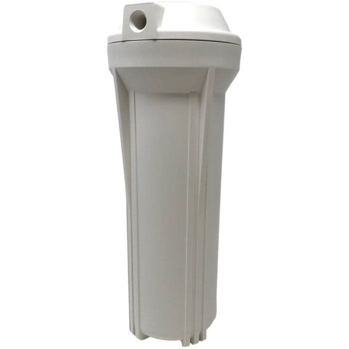 Canister water filter housing for undersink water filter systems. Holds standard 10" canister water filters. For use with under counter mounting bracket.